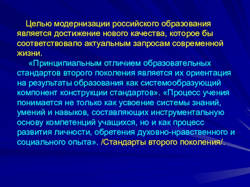 «Принципиальным отличием образовательных стандартов второго поколения является их ориентация на результаты образования как системообразующий компонент конструкции стандартов». «Процесс учения понимается не только как усвоение системы знаний, умений и навыков, составляющих инструментальную основу компетенций учащихся, но и как процесс развития личности, обретения духовно-нравственного и социального опыта». /Стандарты второго поколения/.