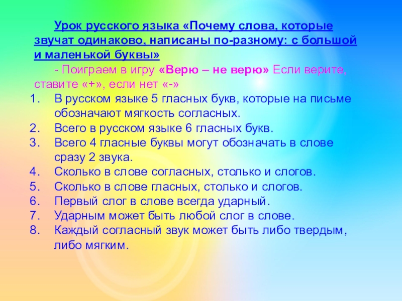 При этом можно использовать несколько вариантов пометок: 2 значка «+» и «V», 3 значка «+», «V», «?» , или 4 значка «+» , «V», «–», «?». Причем, совсем не обязательно помечать каждую строчку или каждую предлагаемую идею. Прочитав один раз, обучающиеся возвращаются к своим первоначальным предположениям, вспоминают, что они знали или предполагали по данной теме раньше, возможно, количество значков увеличится.