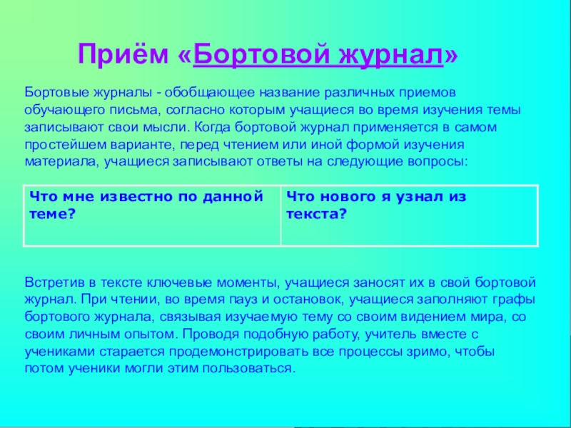 обучающего письма, согласно которым учащиеся во время изучения темы записывают свои мысли. Когда бортовой журнал применяется в самом простейшем варианте, перед чтением или иной формой изучения материала, учащиеся записывают ответы на следующие вопросы: