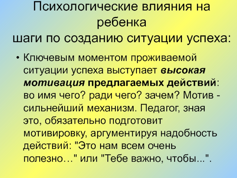 успеха выступает высокая мотивация предлагаемых действий: во имя чего? ради чего? зачем? Мотив - сильнейший механизм. Педагог, зная это, обязательно подготовит мотивировку, аргументируя надобность действий: "Это нам всем очень полезно…" или "Тебе важно, чтобы...".