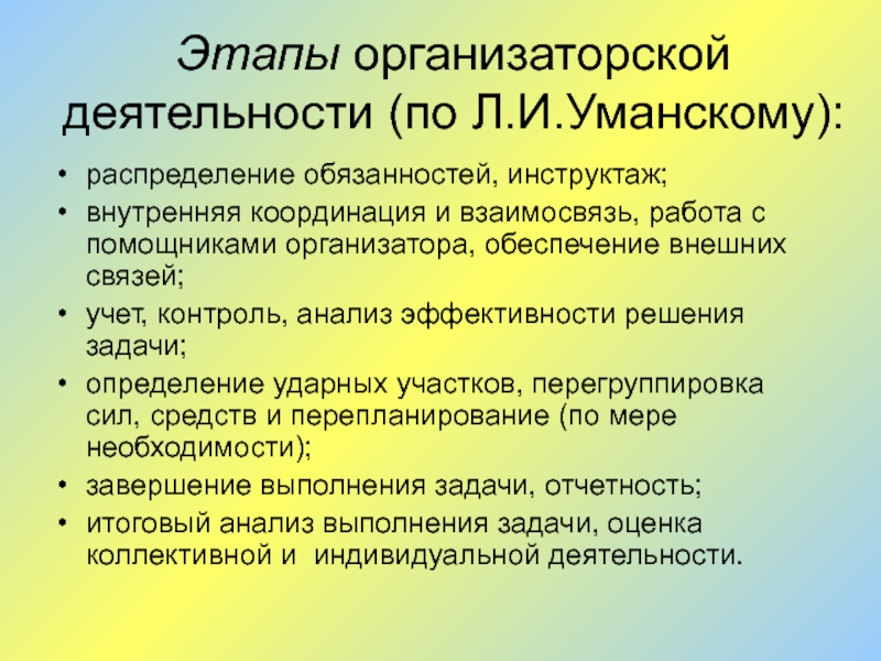 Слайд 24Этапы организаторской деятельности (по Л.И.Уманскому):