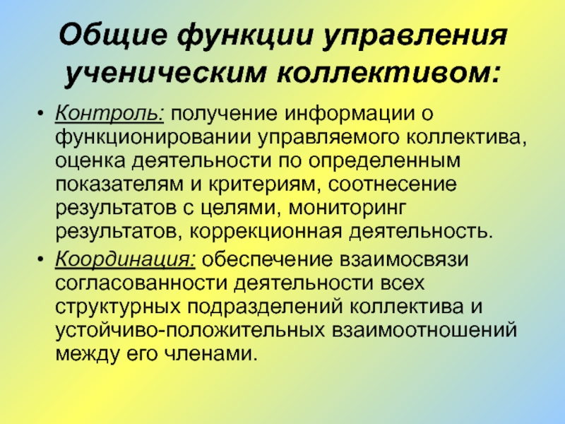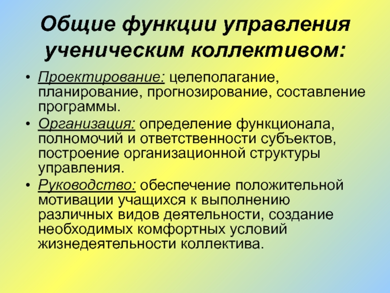 Слайд 18Общие функции управления ученическим коллективом:
