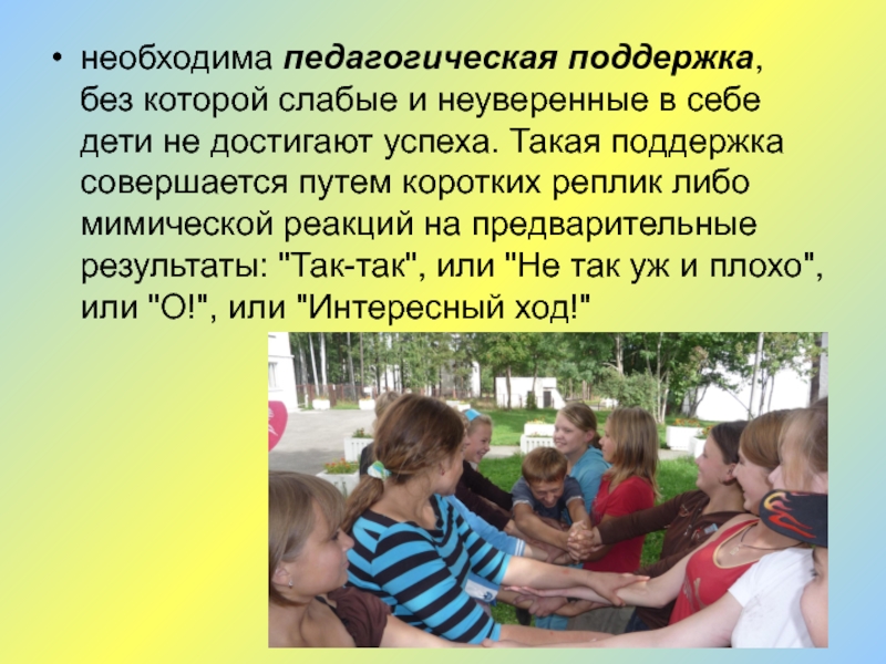Слайд 15необходима педагогическая поддержка, без которой слабые и неуверенные в себе дети