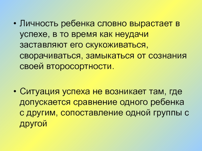 Ситуация успеха не возникает там, где допускается сравнение одного ребенка с другим, сопоставление одной группы с другой