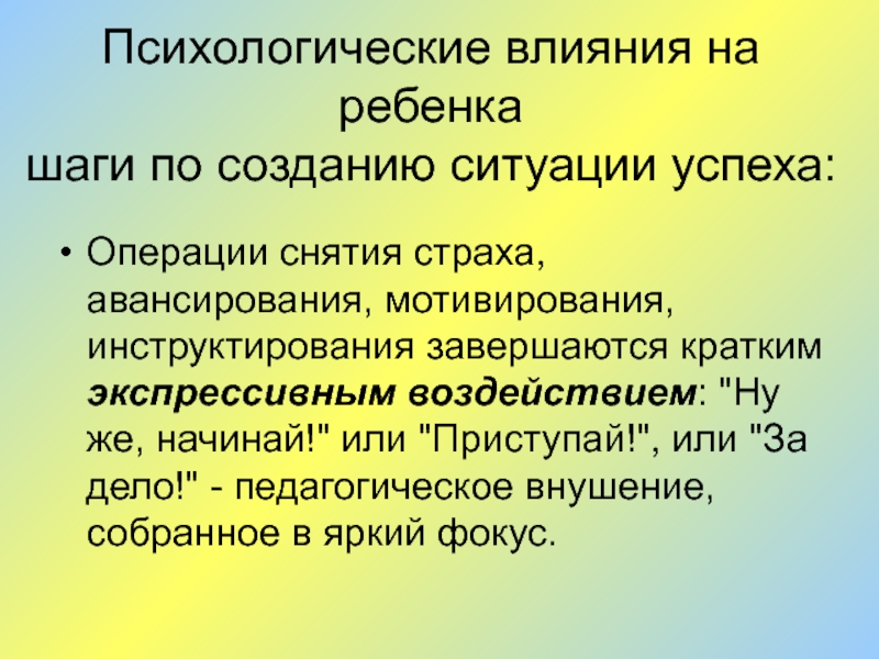 мотивирования, инструктирования завершаются кратким экспрессивным воздействием: "Ну же, начинай!" или "Приступай!", или "За дело!" - педагогическое внушение, собранное в яркий фокус.