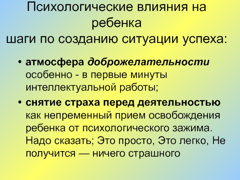 снятие страха перед деятельностью как непременный прием освобождения ребенка от психологического зажима. Надо сказать; Это просто, Это легко, Не получится — ничего страшного