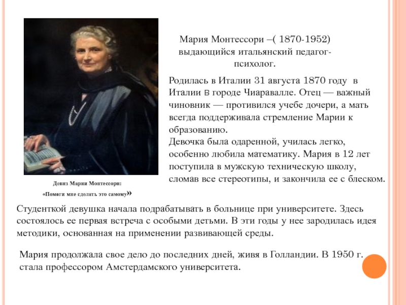 Слайд 3Сначала Мария Монтессори начала применять свою педагогику для особых детей, детей