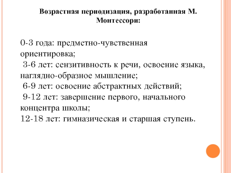 Слайд 6Возрастная периодизация, разработанная М.Монтессори:
