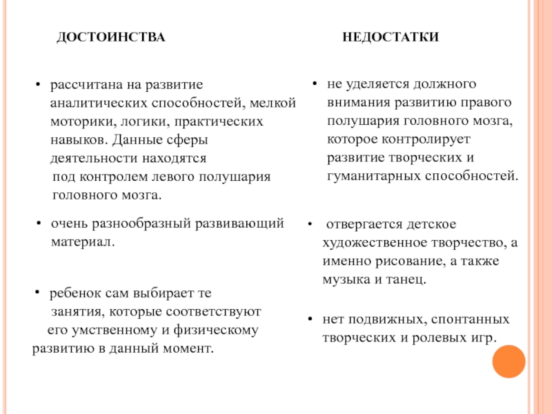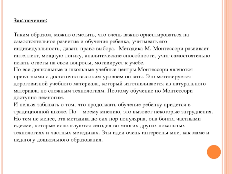 и обучение ребенка, учитывать его индивидуальность, давать право выбора. Методика М. Монтессори развивает интеллект, мощную логику, аналитические способности, учит самостоятельно искать ответы на свои вопросы, мотивирует к учебе.