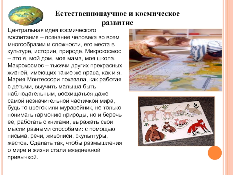 Мария Монтессори показала, как работая с детьми, выучить малыша быть наблюдательным, восхищаться даже самой незначительной частичкой мира, будь то цветок или муравейник, не только понимать гармонию природы, но и беречь ее, работать с книгами, выражать свои мысли разными способами: с помощью письма, речи, живописи, скульптуры, жестов. Сделать так, чтобы размышления о мире и жизни стали ежедневной привычкой.