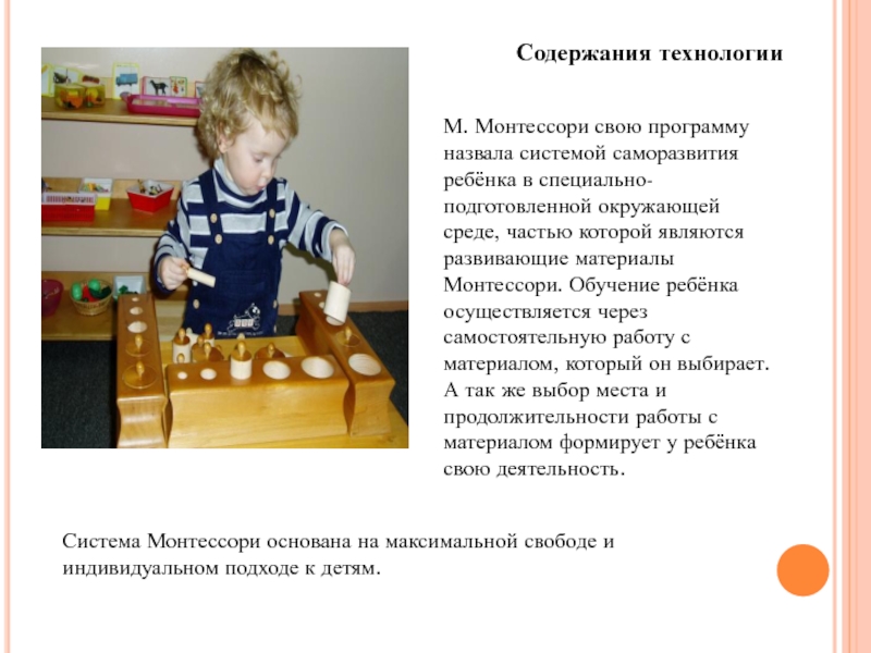 М. Монтессори свою программу назвала системой саморазвития ребёнка в специально-подготовленной окружающей