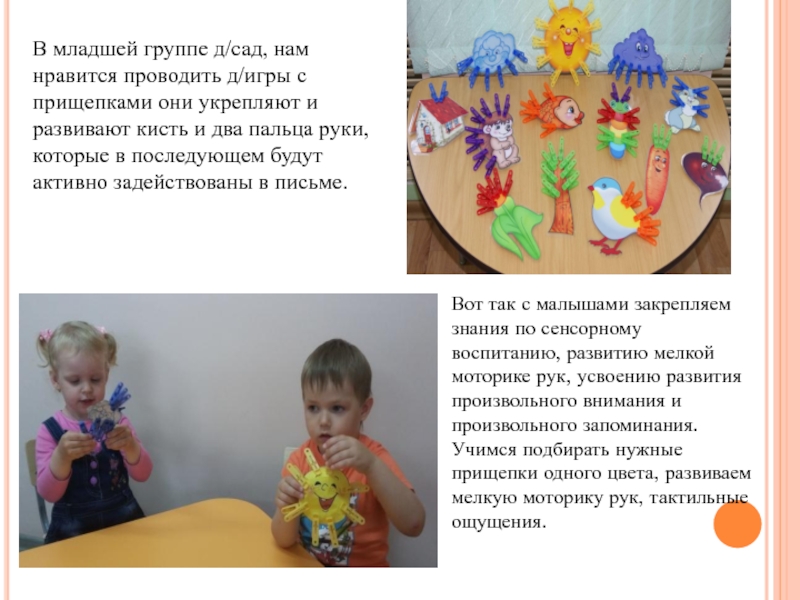 Слайд 23В младшей группе д/сад, нам нравится проводить д/игры с прищепками они