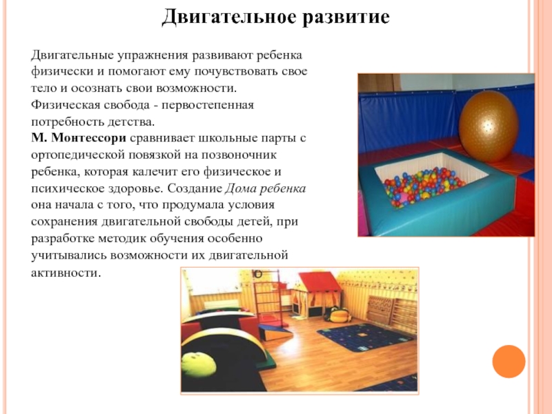 М. Монтессори сравнивает школьные парты с ортопедической повязкой на позвоночник ребенка, которая калечит его физическое и психическое здоровье. Создание Дома ребенка она начала с того, что продумала условия сохранения двигательной свободы детей, при разработке методик обучения особенно учитывались возможности их двигательной активности.