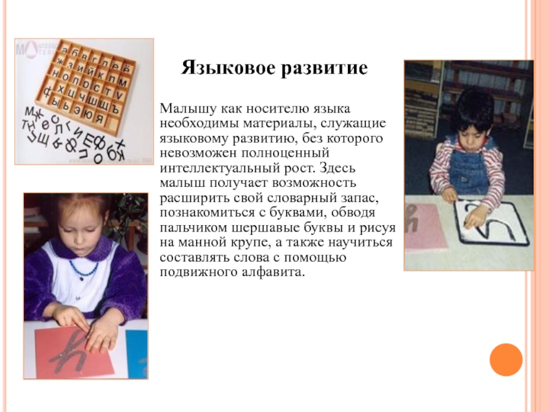 которого невозможен полноценный интеллектуальный рост. Здесь малыш получает возможность расширить свой словарный запас, познакомиться с буквами, обводя пальчиком шершавые буквы и рисуя на манной крупе, а также научиться составлять слова с помощью подвижного алфавита.