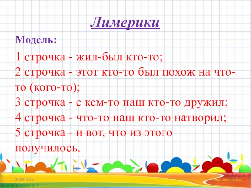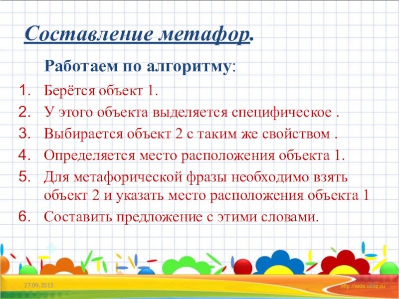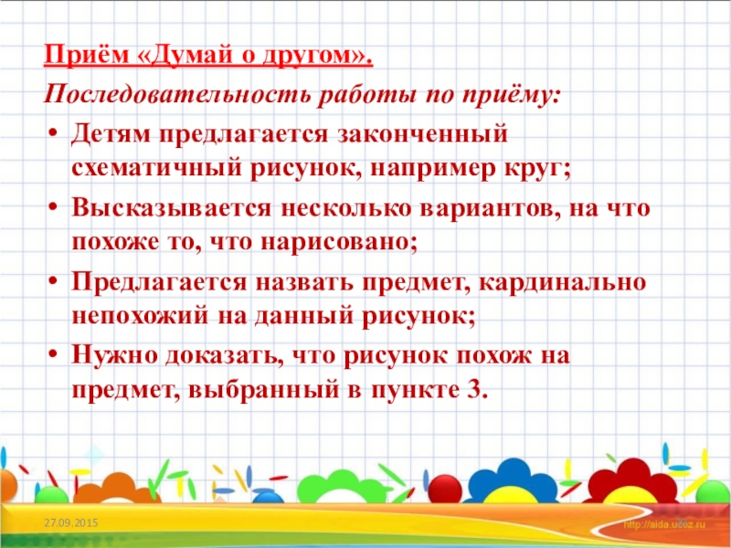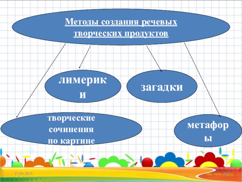 7)метод создания речевых творческих продуктов (лимерики, загадки, метафоры, творческие сочинения по картине);
