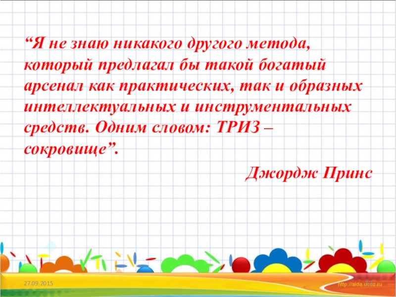 арсенал как практических, так и образных интеллектуальных и инструментальных средств. Одним словом: ТРИЗ – сокровище”.