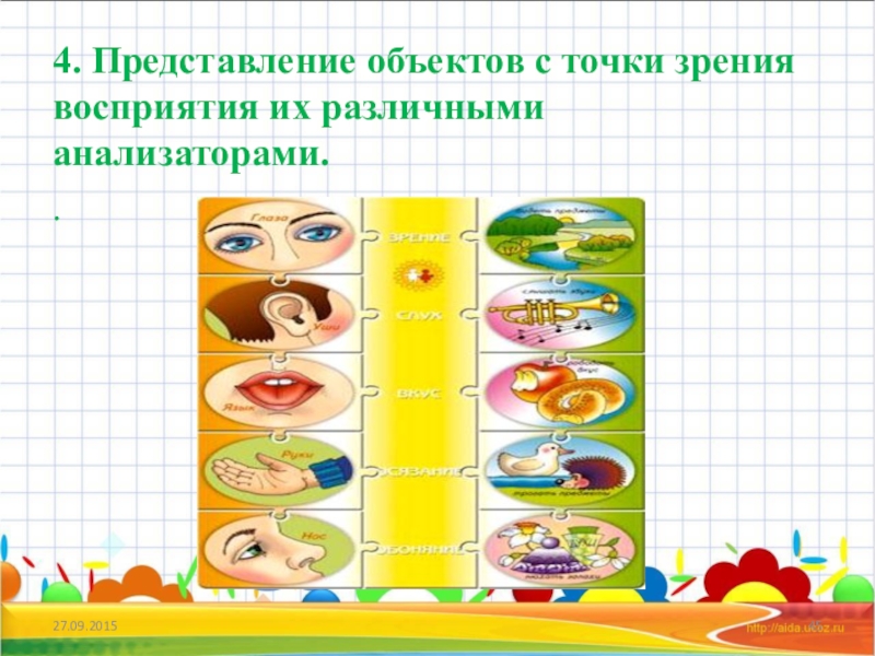 Слайд 454. Представление объектов с точки зрения восприятия их различными анализаторами.