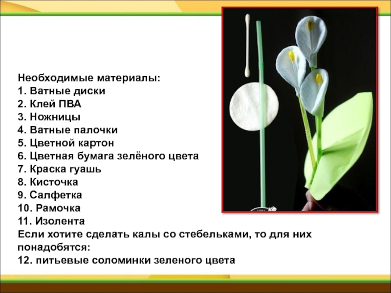 Если хотите сделать калы со стебельками, то для них понадобятся: