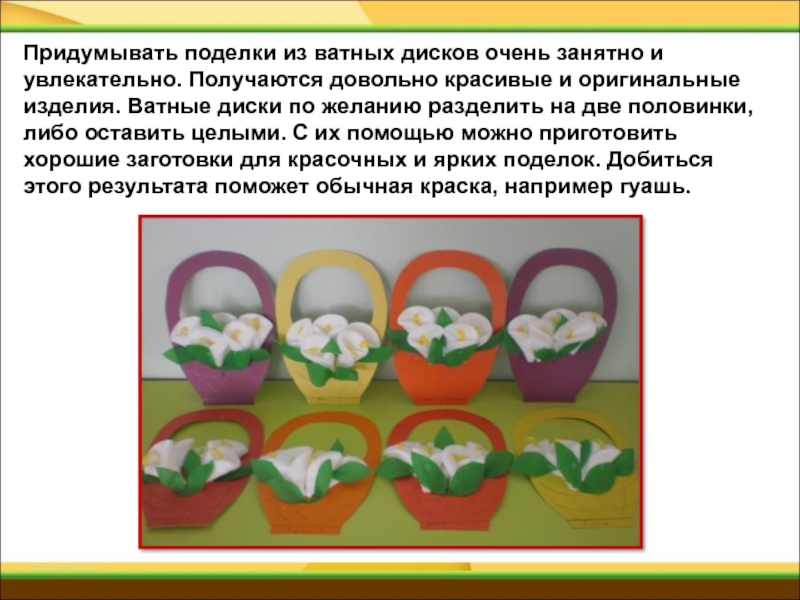 Слайд 2Придумывать поделки из ватных дисков очень занятно и увлекательно. Получаются довольно