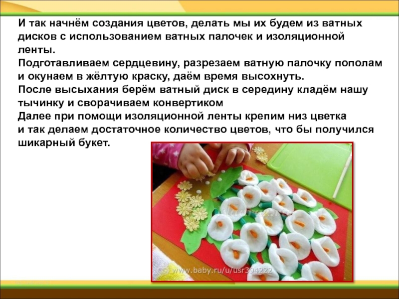 Слайд 4И так начнём создания цветов, делать мы их будем из ватных