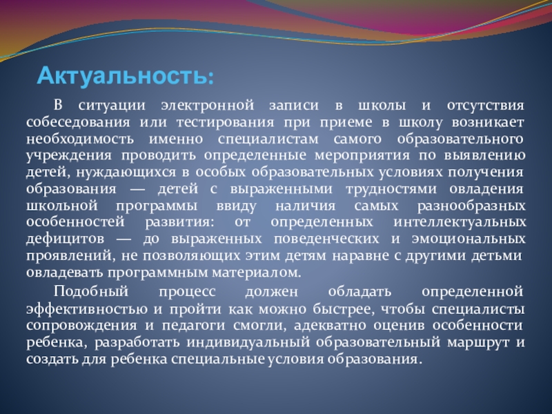 при приеме в школу возникает необходимость именно специалистам самого образовательного учреждения проводить определенные мероприятия по выявлению детей, нуждающихся в особых образовательных условиях получения образования — детей с выраженными трудностями овладения школьной программы ввиду наличия самых разнообразных особенностей развития: от определенных интеллектуальных дефицитов — до выраженных поведенческих и эмоциональных проявлений, не позволяющих этим детям наравне с другими детьми овладевать программным материалом.