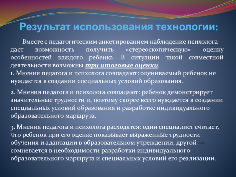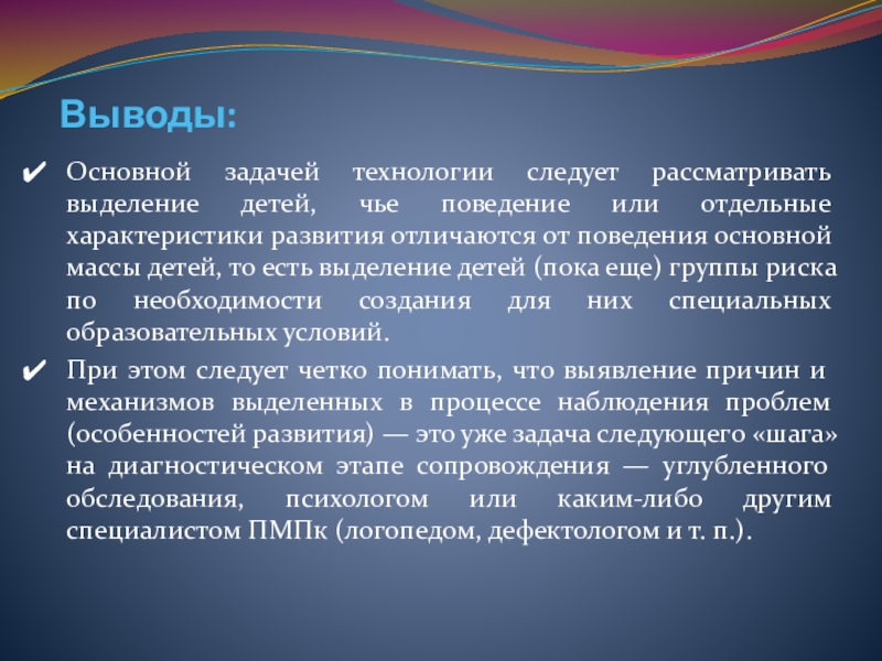Основной задачей технологии следует рассматривать выделение детей, чье поведение или отдельные