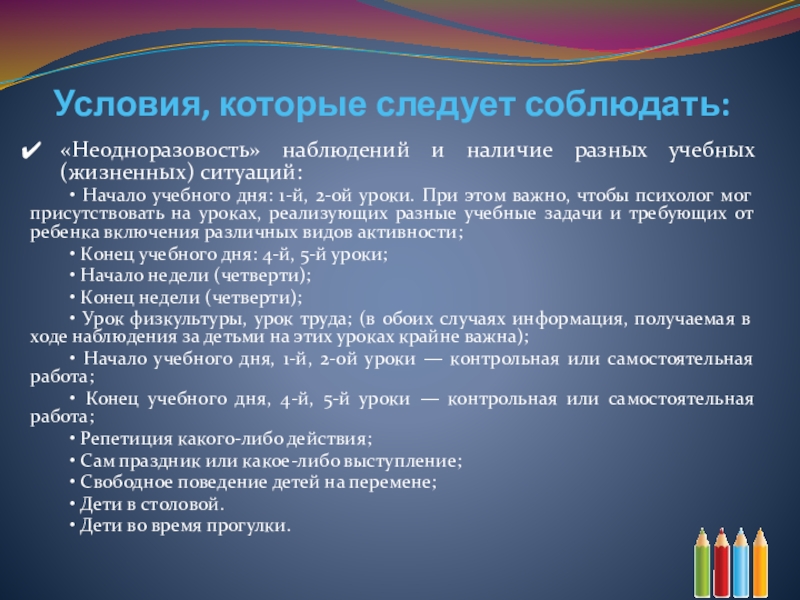 Наблюдения психолога должно быть организовано как на уроках, так и во внеурочной деятельности по договорённости с учителем и воспитателем