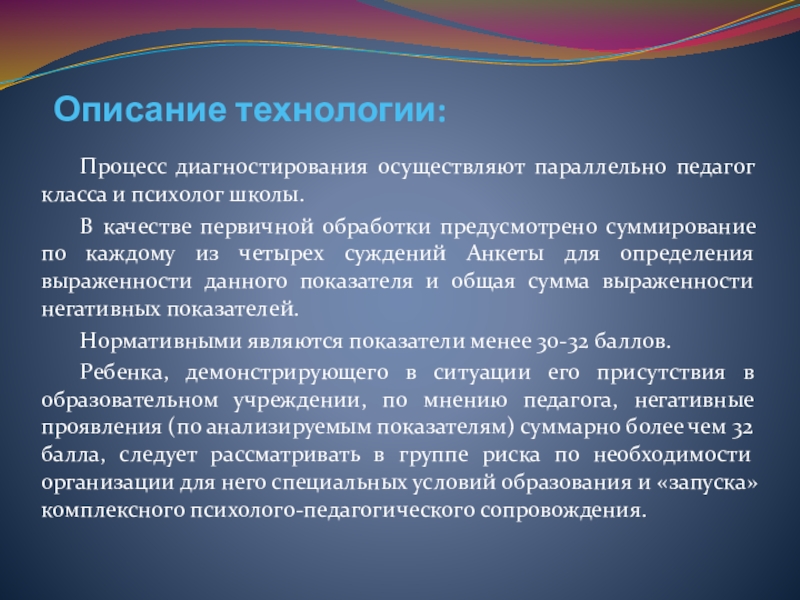 Ребенка, демонстрирующего в ситуации его присутствия в образовательном учреждении, по мнению педагога, негативные проявления (по анализируемым показателям) суммарно более чем 32 балла, следует рассматривать в группе риска по необходимости организации для него специальных условий образования и «запуска» комплексного психолого-педагогического сопровождения.