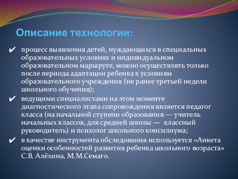 в качестве инструмента обследования используется «Анкета оценки особенностей развития ребенка школьного возраста» С.В. Алёхина, М.М.Семаго.