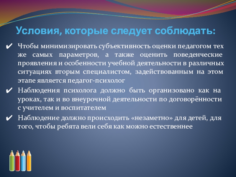 Наблюдение должно происходить «незаметно» для детей, для того, чтобы ребята вели себя как можно естественнее