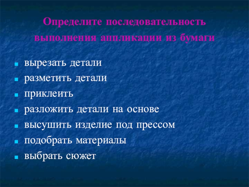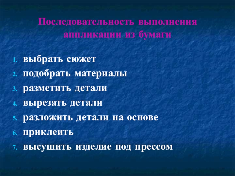 Последовательность выполнения аппликации из бумагивыбрать сюжетподобрать материалыразметить деталивырезать деталиразложить детали на основеприклеитьвысушить изделие под прессом