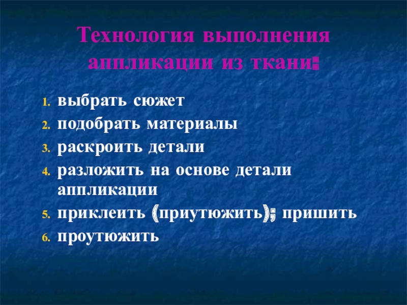 Технология выполнения аппликации из ткани:выбрать сюжетподобрать материалыраскроить деталиразложить на основе детали аппликацииприклеить (приутюжить); пришитьпроутюжить