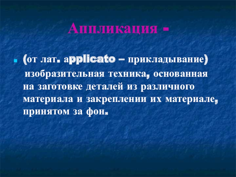 Аппликация -(от лат. аpplicato – прикладывание) изобразительная техника, основанная на заготовке деталей из различного материала и закреплении их материале, принятом за фон.