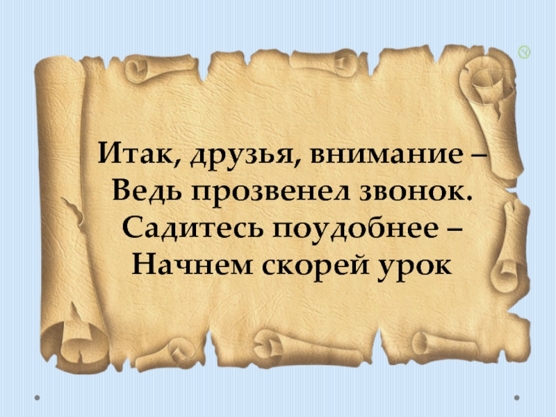 Итак, друзья, внимание – Ведь прозвенел звонок.Садитесь поудобнее –Начнем скорей урок