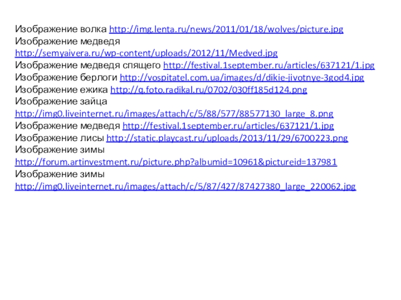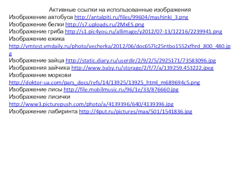 Активные ссылки на использованные изображенияИзображение автобуса http://antalpiti.ru/files/99604/mashinki_3.pngИзображение белки http://s7.uploads.ru/2MxES.pngИзображение гриба http://s1.pic4you.ru/allimage/y2012/07-13/12216/2239941.pngИзображение ежика http://vmtest.vmdaily.ru/photo/vecherka/2012/06/doc657lc25ntbo1552xfhrd_800_480.jpgИзображение зайца http://static.diary.ru/userdir/2/9/2/5/2925171/73583096.jpgИзображения зайчика http://www.baby.ru/storage/2/f/7/a/139259.453222.jpegИзображение моркови http://doktor-ua.com/pars_docs/refs/14/13925/13925_html_m689694c5.pngИзображение лисы http://file.mobilmusic.ru/96/1e/33/876660.jpgИзображение лисички http://www3.picturepush.com/photo/a/4139396/640/4139396.jpgИзображение лабиринта http://4put.ru/pictures/max/501/1541836.jpg
