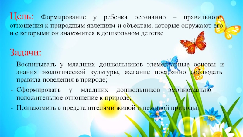 Сформировать у младших дошкольников эмоционально – положительное отношение к природе;
