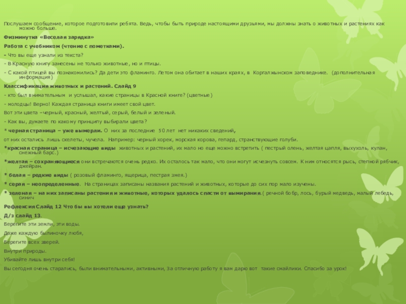 Учитель: - Как вы думаете, почему появилась такая идея создать эту книгу? ( люди охотятся рвут цветы и не думают, что их становится все меньше и меньше и они могут погибнуть.)