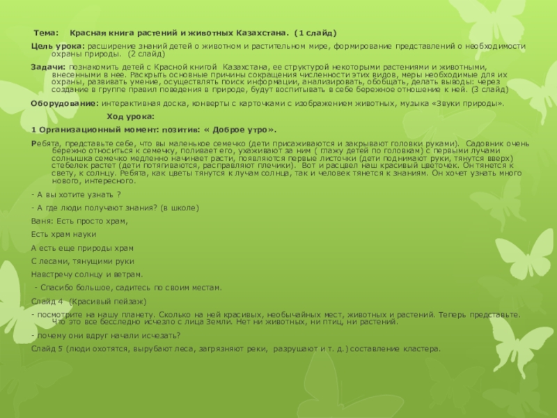Задачи: познакомить детей с Красной книгой Казахстана, ее структурой некоторыми растениями и животными, внесенными в нее. Раскрыть основные причины сокращения численности этих видов, меры необходимые для их охраны, развивать умение, осуществлять поиск информации, анализировать, обобщать, делать выводы: через создание в группе правил поведения в природе, будут воспитывать в себе бережное отношение к ней. (3 слайд)