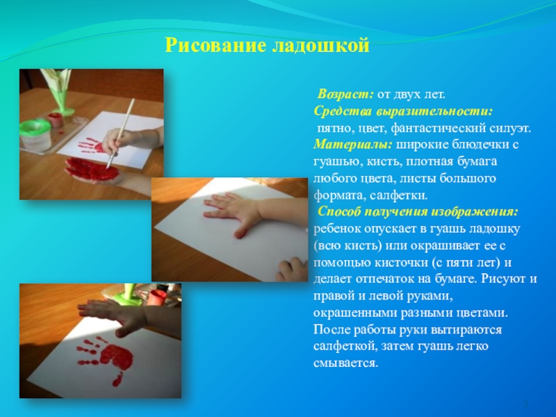 Способ получения изображения: ребенок опускает в гуашь ладошку (всю кисть) или окрашивает ее с помощью кисточки (с пяти лет) и делает отпечаток на бумаге. Рисуют и правой и левой руками, окрашенными разными цветами. После работы руки вытираются салфеткой, затем гуашь легко смывается.