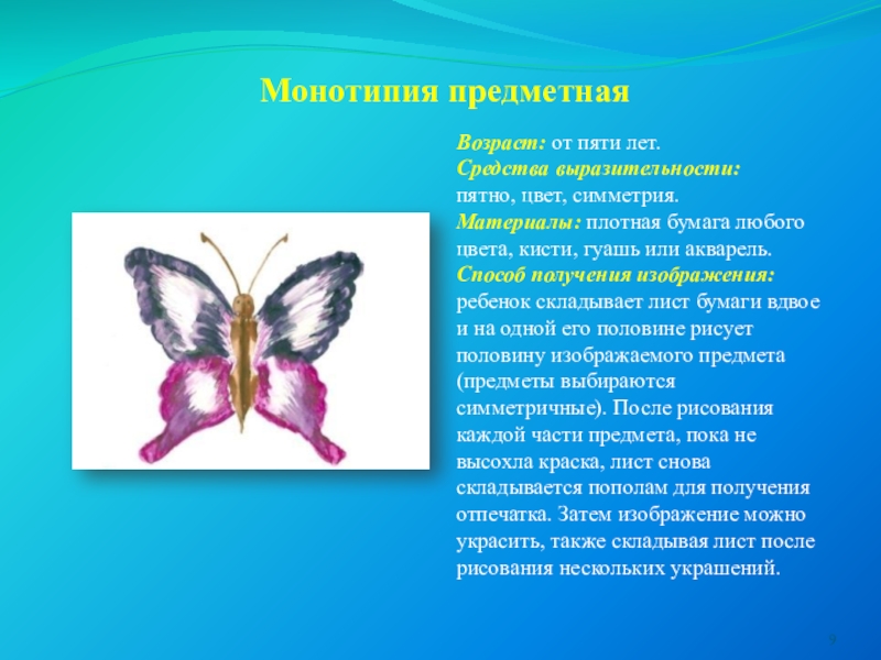 Способ получения изображения: ребенок складывает лист бумаги вдвое и на одной его половине рисует половину изображаемого предмета (предметы выбираются симметричные). После рисования каждой части предмета, пока не высохла краска, лист снова складывается пополам для получения отпечатка. Затем изображение можно украсить, также складывая лист после рисования нескольких украшений.
