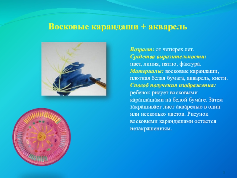ребенок рисует восковыми карандашами на белой бумаге. Затем закрашивает лист акварелью в один или несколько цветов. Рисунок восковыми карандашами остается незакрашенным.