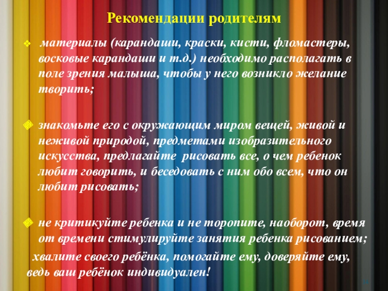 не критикуйте ребенка и не торопите, наоборот, время от времени стимулируйте занятия ребенка рисованием;