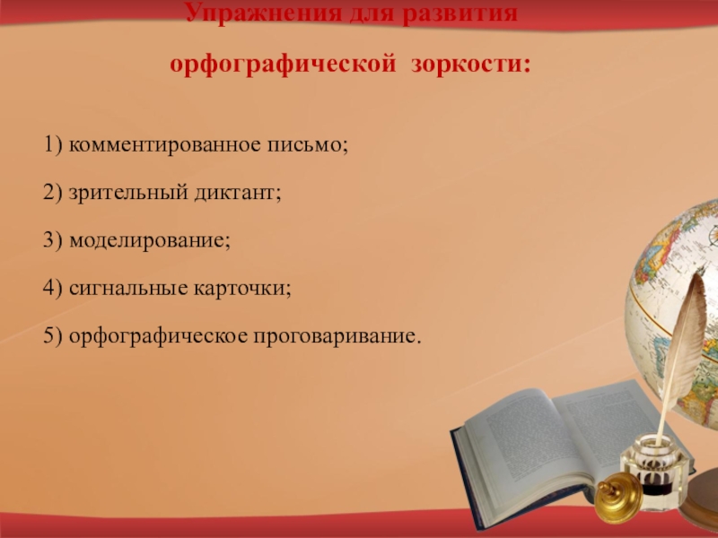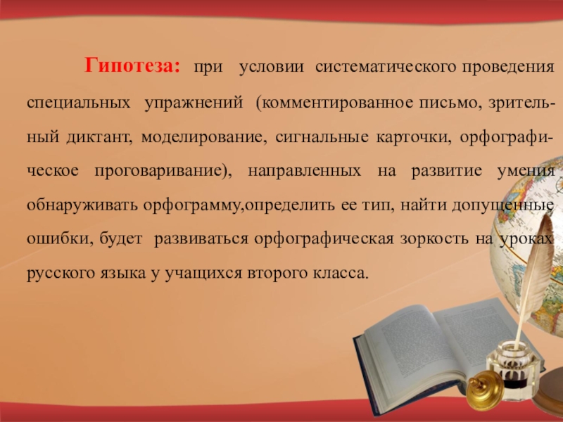 условии систематического проведения специальных упражнений (комментированное письмо, зритель-ный диктант, моделирование, сигнальные карточки, орфографи-ческое проговаривание), направленных на развитие умения обнаруживать орфограмму,определить ее тип, найти допущенные ошибки, будет развиваться орфографическая зоркость на уроках русского языка у учащихся второго класса.