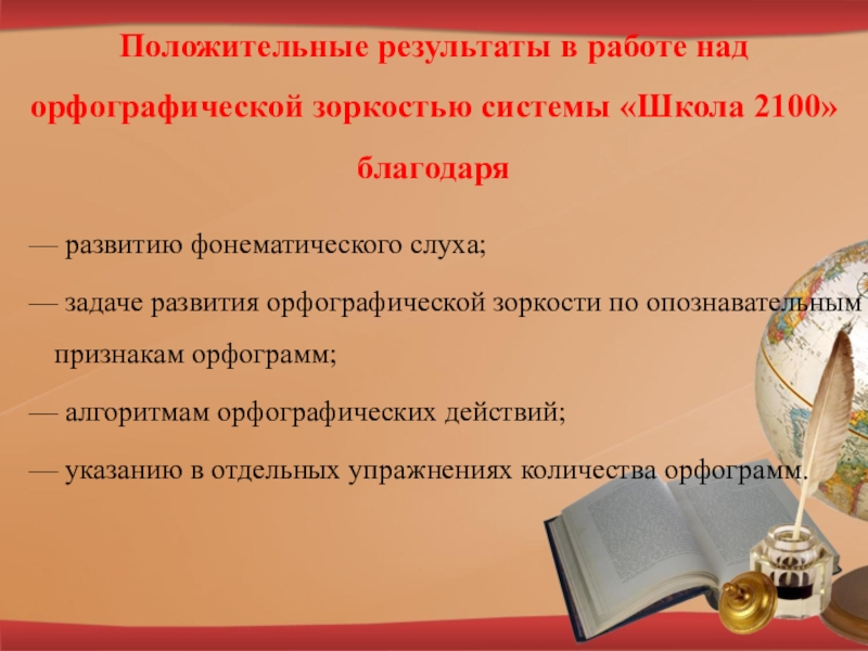 Слайд 23Положительные результаты в работе над орфографической зоркостью системы «Школа 2100» благодаря