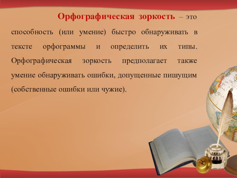 Орфографическая зоркость – это способность (или умение) быстро обнаруживать в тексте орфограммы и определить их типы. Орфографическая зоркость предполагает также умение обнаруживать ошибки, допущенные пишущим (собственные ошибки или чужие).