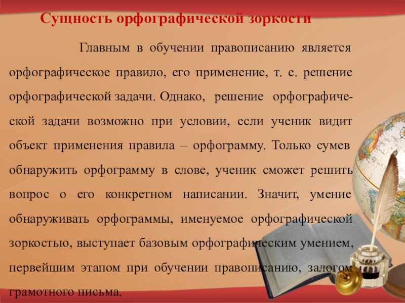 Главным в обучении правописанию является орфографическое правило, его применение, т. е. решение орфографической задачи. Однако, решение орфографиче-ской задачи возможно при условии, если ученик видит объект применения правила – орфограмму. Только сумев обнаружить орфограмму в слове, ученик сможет решить вопрос о его конкретном написании. Значит, умение обнаруживать орфограммы, именуемое орфографической зоркостью, выступает базовым орфографическим умением, первейшим этапом при обучении правописанию, залогом грамотного письма.