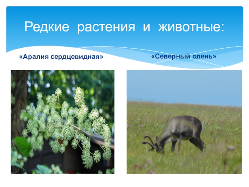 Редкие растения и животные:«Аралия сердцевидная»«Северный олень»