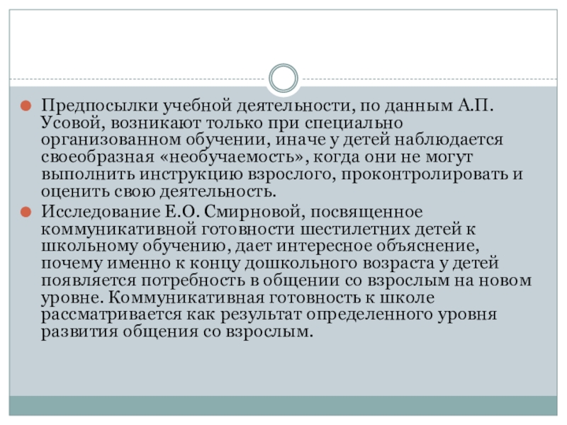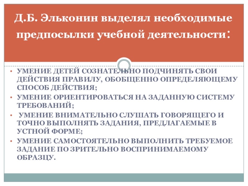 Д.Б. Эльконин выделял необходимые предпосылки учебной деятельности: