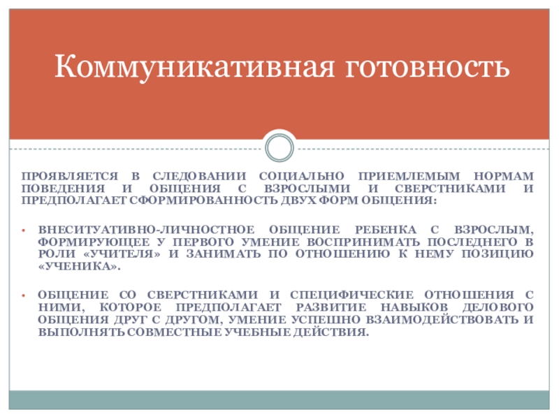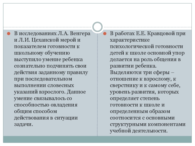 В работах Е.Е. Кравцовой при характеристике психологической готовности детей к школе основной упор делается на роль общения в развитии ребенка. Выделяются три сферы – отношение к взрослому, к сверстнику и к самому себе, уровень развития, которых определяет степень готовности к школе и определенным образом соотносится с основными структурными компонентами учебной деятельности.