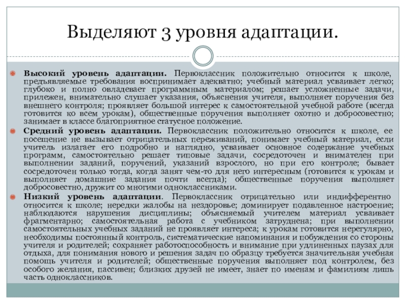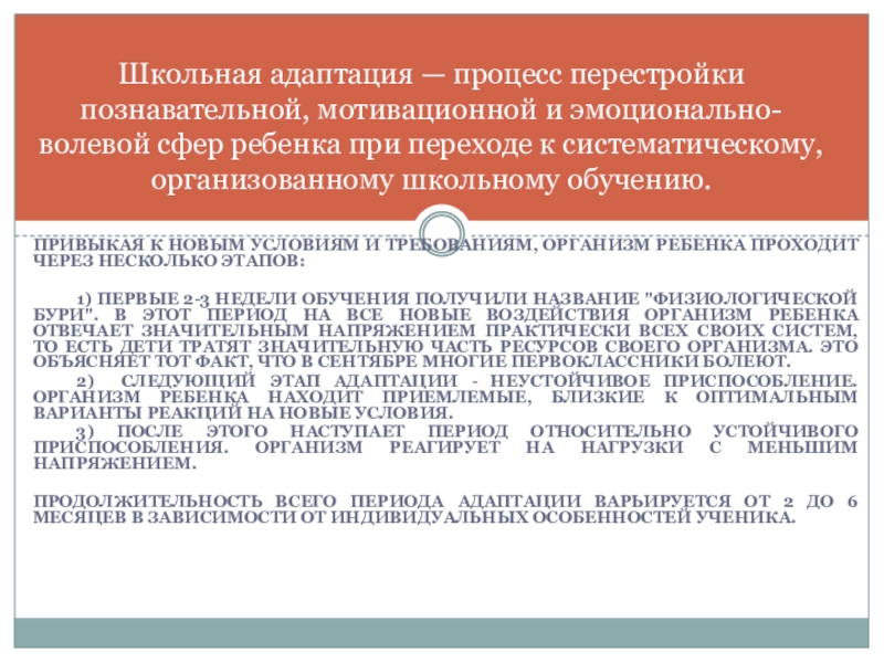 Школьная адаптация — процесс перестройки познавательной, мотивационной и эмоционально-волевой сфер ребенка при переходе к систематическому, организованному школьному обучению.
